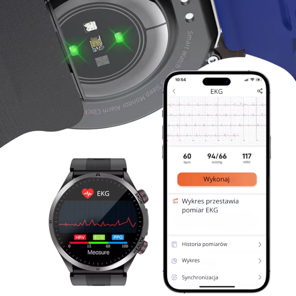 - Natychmiastowy wynik – zegarek automatycznie przesyła dane do aplikacji mobilnej, prezentując je w przejrzysty sposób, co umożliwia łatwą analizę pomiarów.