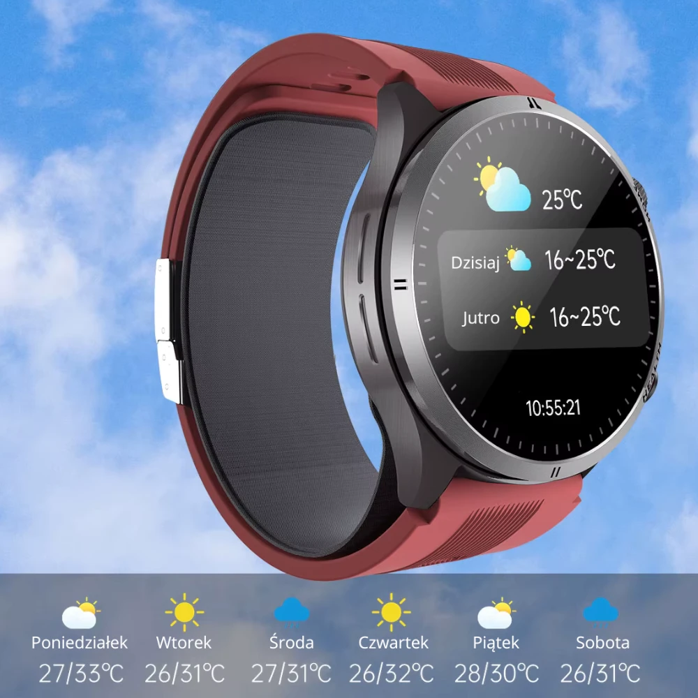 Zegarek automatycznie synchronizuje dane pogodowe z Twoim smartfonem za pośrednictwem połączenia Bluetooth, co gwarantuje dokładność i aktualność wyświetlanych informacji. Dzięki temu możesz łatwo dostosować swój ubiór, zaplanować aktywności na świeżym powietrzu lub zdecydować, czy warto zabrać ze sobą parasol.