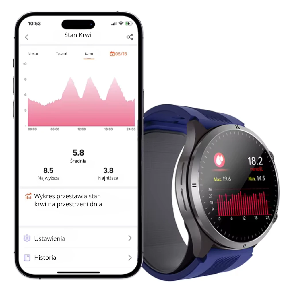 Historia i analiza trendów – zegarek zapisuje wyniki, umożliwiając śledzenie poziomu cukru w dłuższym okresie i ocenę wpływu diety oraz stylu życia na stan zdrowia.