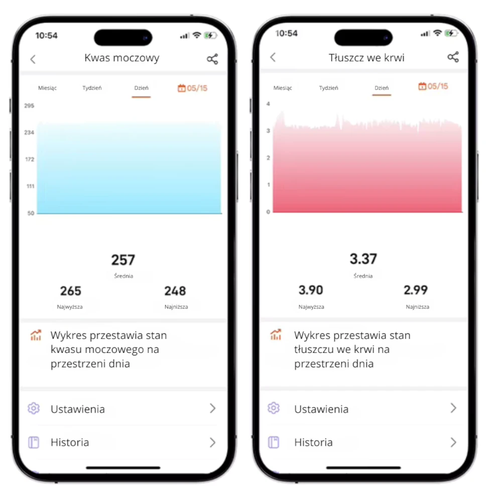 Wszystkie wyniki są zapisywane w aplikacji mobilnej, co umożliwia obserwację zmian w czasie oraz ocenę wpływu diety na zdrowie.