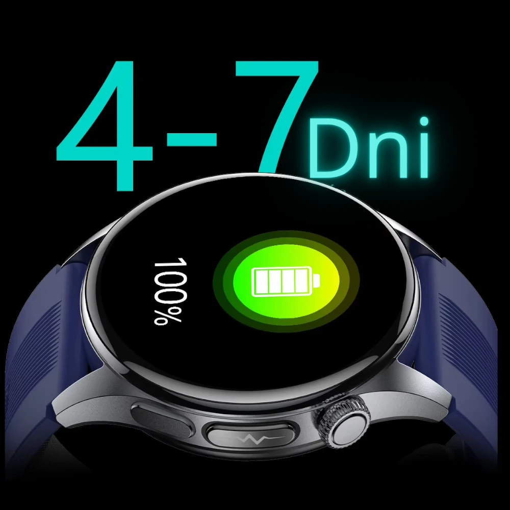 Ładowanie odbywa się poprzez magnetyczny przewód, który stabilnie łączy się z zegarkiem i umożliwia szybkie oraz wygodne uzupełnienie energii. Pełne naładowanie trwa około 3 godzin, dzięki czemu urządzenie szybko wraca do pełnej gotowości — niezależnie od tego, czy korzystasz z pomiarów EKG, monitoringu snu, funkcji zdrowotnych czy rozmów Bluetooth.
