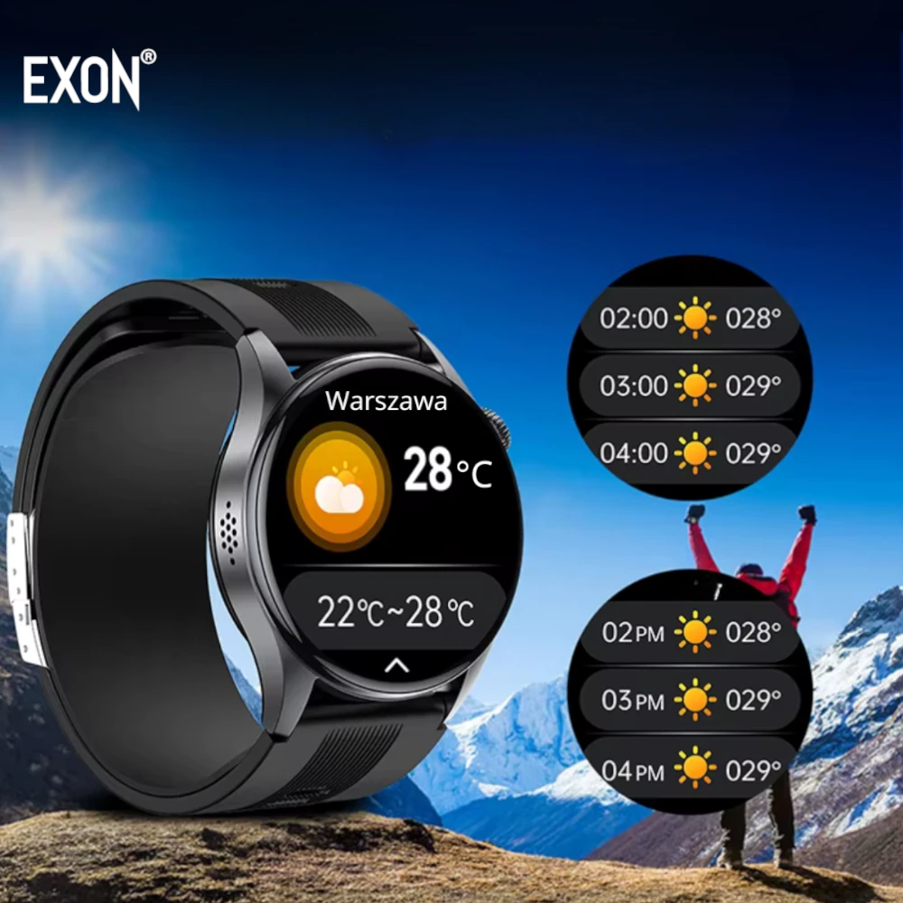 Kardiowatch EKG Exon Alvio oferuje funkcję prognozy pogody, która pomaga zaplanować dzień i przygotować się na zmieniające się warunki atmosferyczne. Smartwatch automatycznie synchronizuje dane pogodowe ze smartfona, wyświetlając je na czytelnym ekranie SUPER AMOLED.