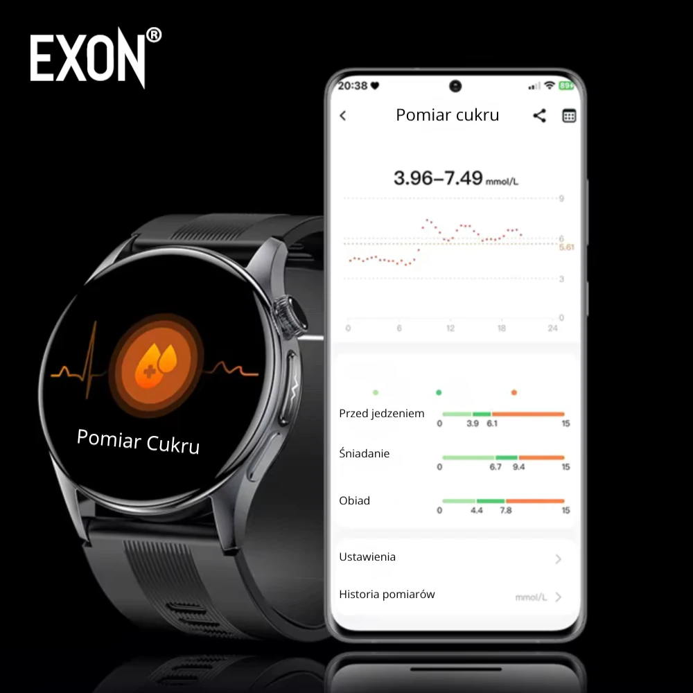 Kardiowatch EKG Exon Alvio to nowoczesny smartwatch zdrowotny, który umożliwia codzienny, bezinwazyjny pomiar poziomu glukozy – bez igieł, bez nakłuwania i bez konieczności używania tradycyjnych glukometrów. Dzięki zastosowaniu innowacyjnej technologii optycznej, zegarek analizuje parametry krwi przy pomocy zaawansowanych czujników fotonowych. Wynik pojawia się na ekranie urządzenia już po kilkudziesięciu sekundach, a pełna historia zapisów dostępna jest w aplikacji.