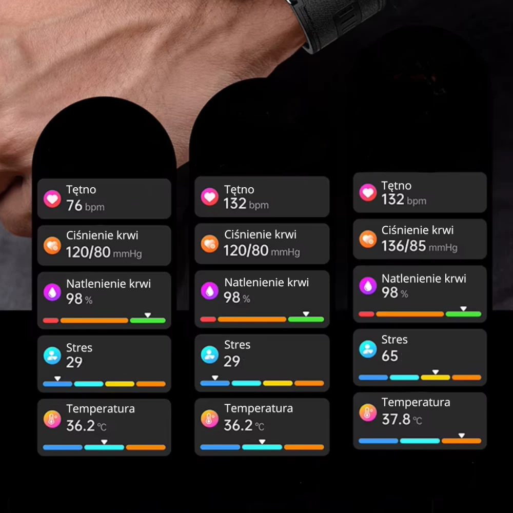 • Optyczny czujnik PPG – zapewniający szybki odczyt parametrów w czasie rzeczywistym, idealny do natychmiastowego sprawdzenia stanu organizmu.