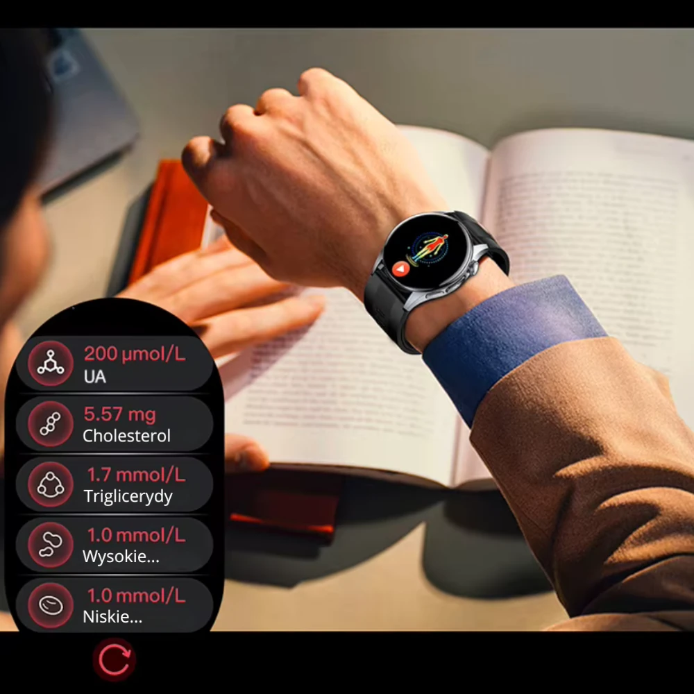 Kardiowatch EKG Exon Alvio to nie tylko smartwatch z funkcją EKG, lecz także wszechstronny asystent metaboliczny, który pomaga monitorować kluczowe parametry zdrowotne w sposób całkowicie bezpieczny i bezinwazyjny. Dzięki zaawansowanym czujnikom optycznym zegarek umożliwia orientacyjny pomiar kwasu moczowego, cholesterolu całkowitego oraz triglicerydów – wskaźników ściśle powiązanych z kondycją serca, układu krążenia i stawów.