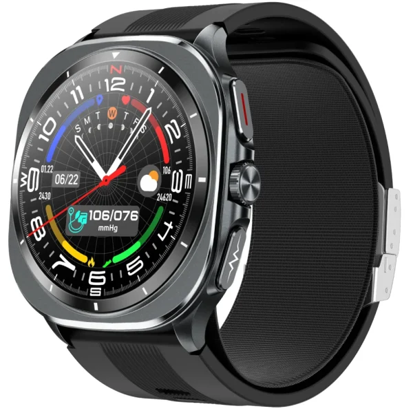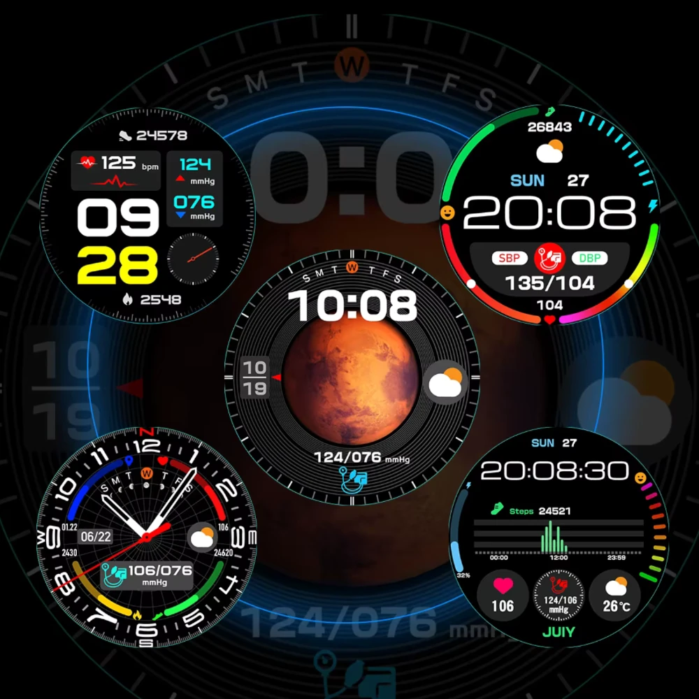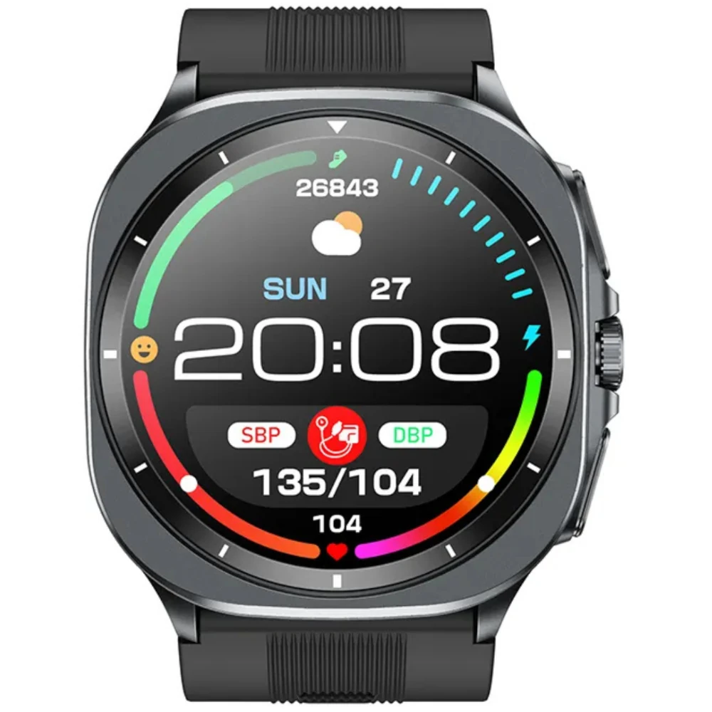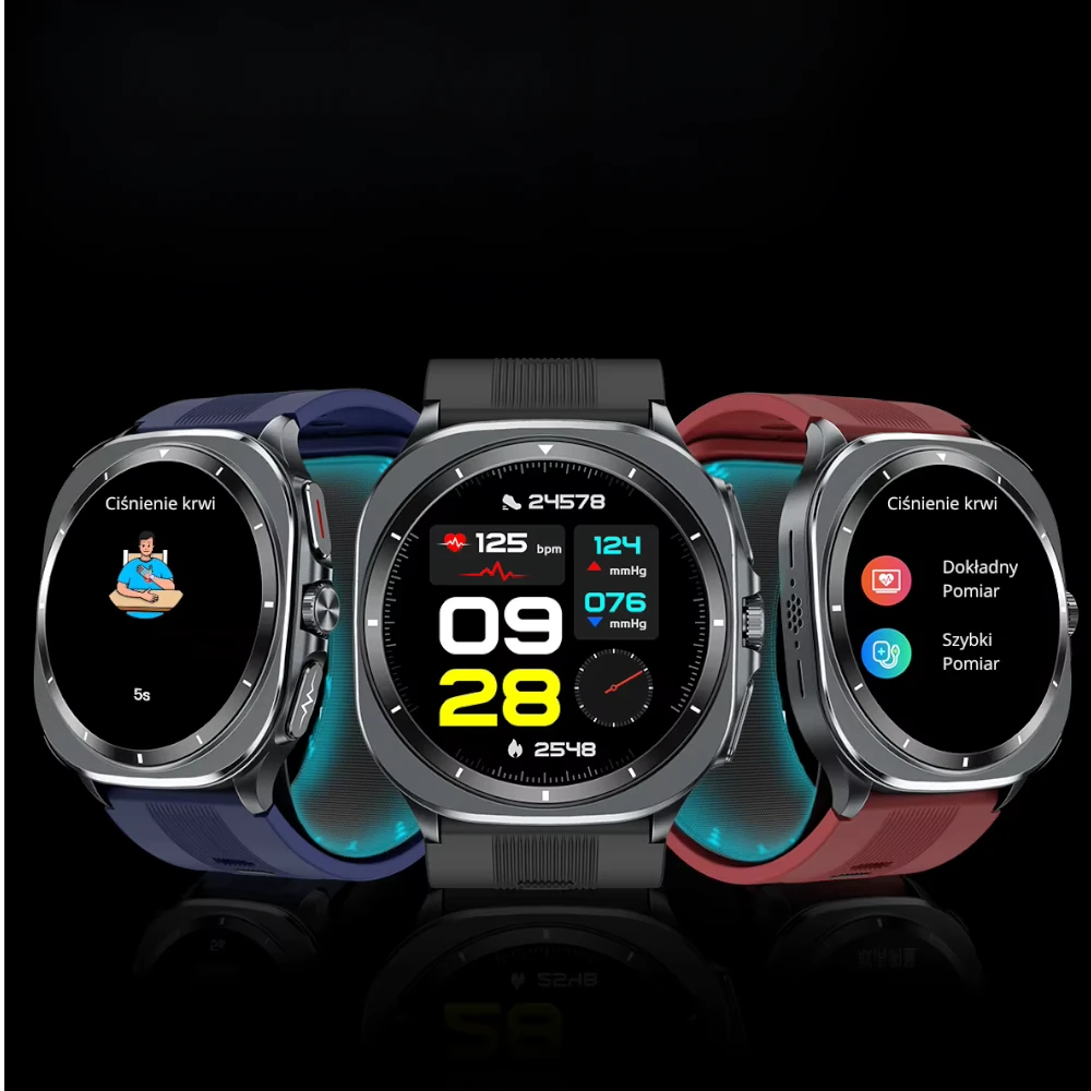 | Funkcje | czasomierz, alert o zasiedzeniu, analiza składu krwi, automatyczny monitoring tętna, budzik alarm, cel kroków, ciśnieniomierz, funkcja opiekuna, funkcja rozmów, funkcja SOS, godzina data dzień, historia aktywności, historia kroków, kalendarz, kalibracja pomiarów, kalkulator, krokomierz, kwas moczowy, monitor bezdechu sennego, monitor snu, natlenienie krwi, pogoda, pomiar cukru we krwi, pomiar EKG, pomiar tętna, powiadomienia, przebyty dystans, regulacja jasności podświetlenia, spalone kalorie, sterowanie muzyką, stoper, termometr, tłuszcze we krwi, tryb samolotowy, tryby sportowe, wiadomości, wibracje, zdalny aparat, zmienne tarcze, znajdź telefon |