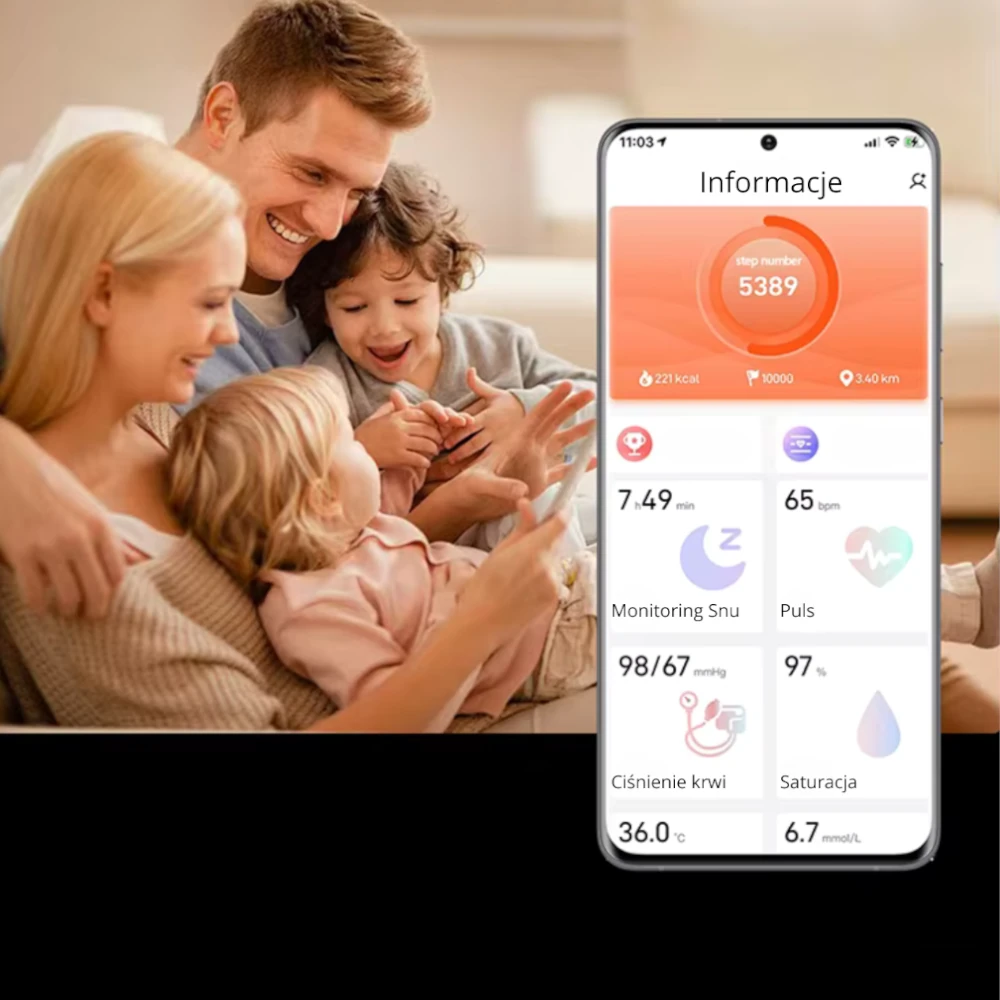 Możliwość obserwacji kluczowych danych zdrowotnych w czasie rzeczywistym, takich jak: tętno, zapis EKG, temperatura ciała czy poziom stresu.
