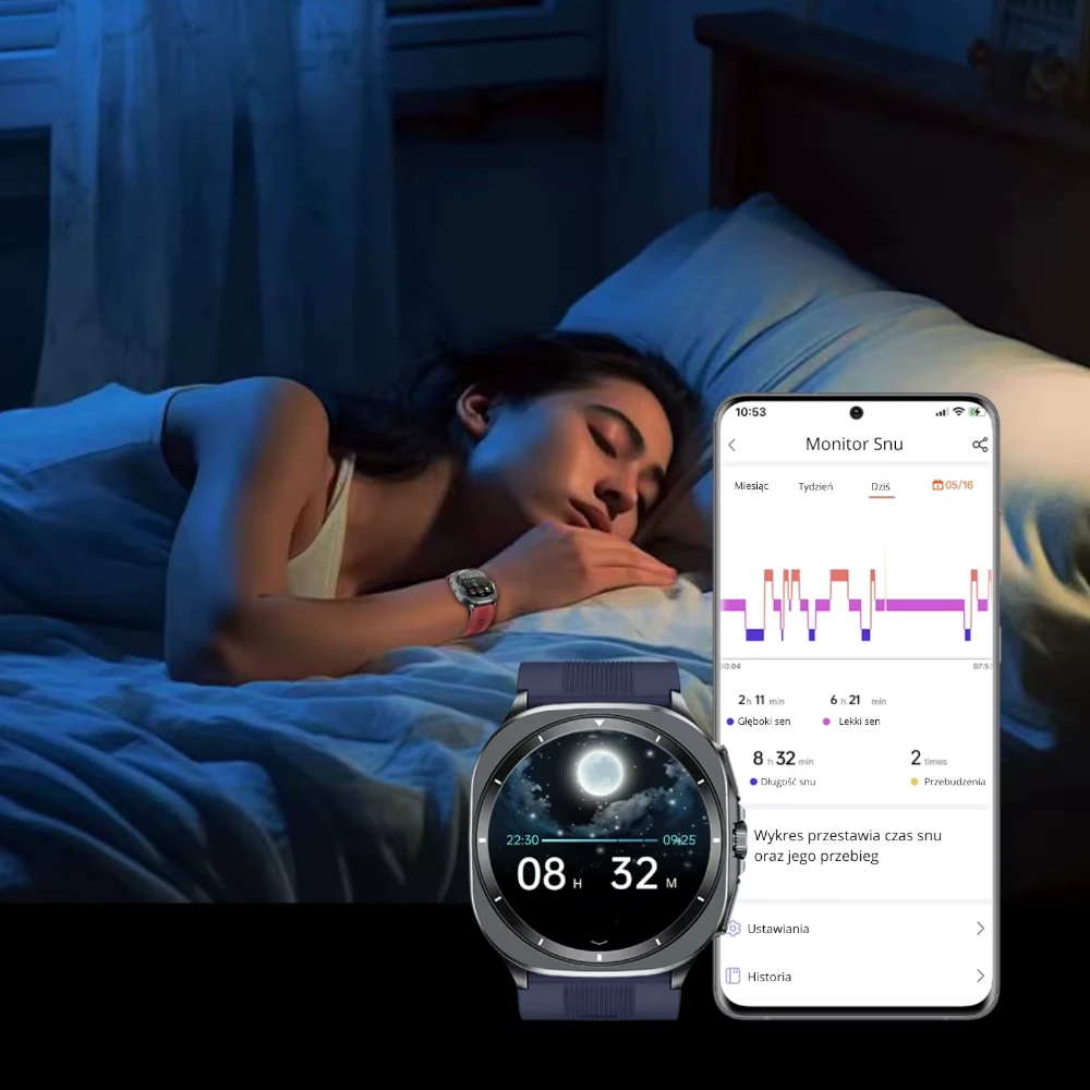 Wykrywanie zakłóceń snu – zegarek rejestruje częste przebudzenia, skoki tętna i sygnały mogące wskazywać na bezdech senny lub stres.