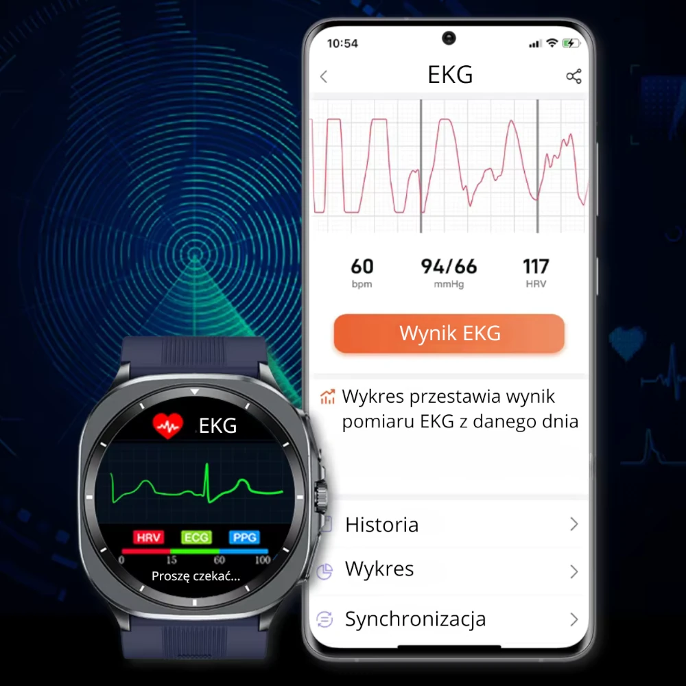 Wszystkie wyniki są automatycznie zapisywane i synchronizowane z aplikacją Kardiowatch, co umożliwia długoterminową analizę danych, obserwację zmian oraz przygotowanie do wizyty u specjalisty.