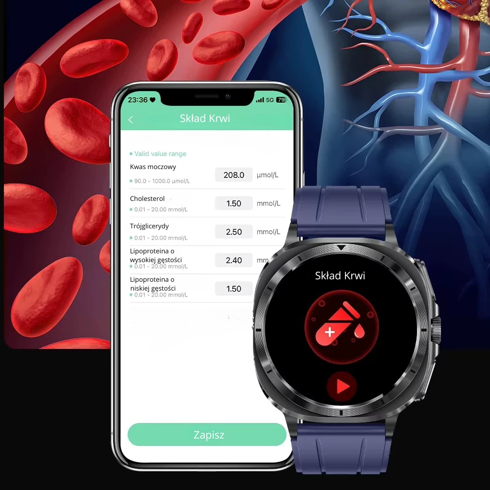 Kardiowatch oferuje unikalną funkcję monitorowania składu krwi, co pozwala na kompleksową kontrolę zdrowia i wczesne wykrywanie nieprawidłowości: