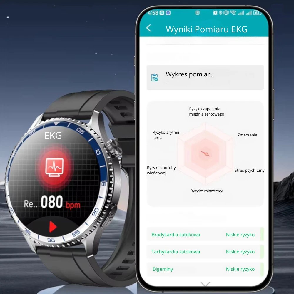 Kardiowatch EKG Exon Care to nowoczesny zegarek kardiologiczny, który zapewnia kompleksowy monitoring zdrowia dzięki zaawansowanym czujnikom. Wyposażony w precyzyjny pulsometr, umożliwia dokładne pomiary EKG, tętna, ciśnienia krwi, saturacji (SpO2), temperatury ciała, intensywności oddychania oraz HRV. Dzięki zaawansowanej technologii użytkownik otrzymuje rzetelne i precyzyjne dane zdrowotne, które pomagają lepiej kontrolować kondycję organizmu na co dzień.