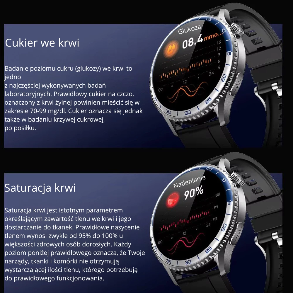 Kardiowatch EKG Exon Care to pierwszy inteligentny zegarek wyposażony w funkcję monitorowania poziomu glukozy, pozwalającą na kontrolę cukru we krwi bez konieczności używania igieł. To przełomowe rozwiązanie idealnie sprawdzi się u osób dbających o zdrowie metaboliczne i chcących monitorować poziom cukru w dowolnym momencie dnia.