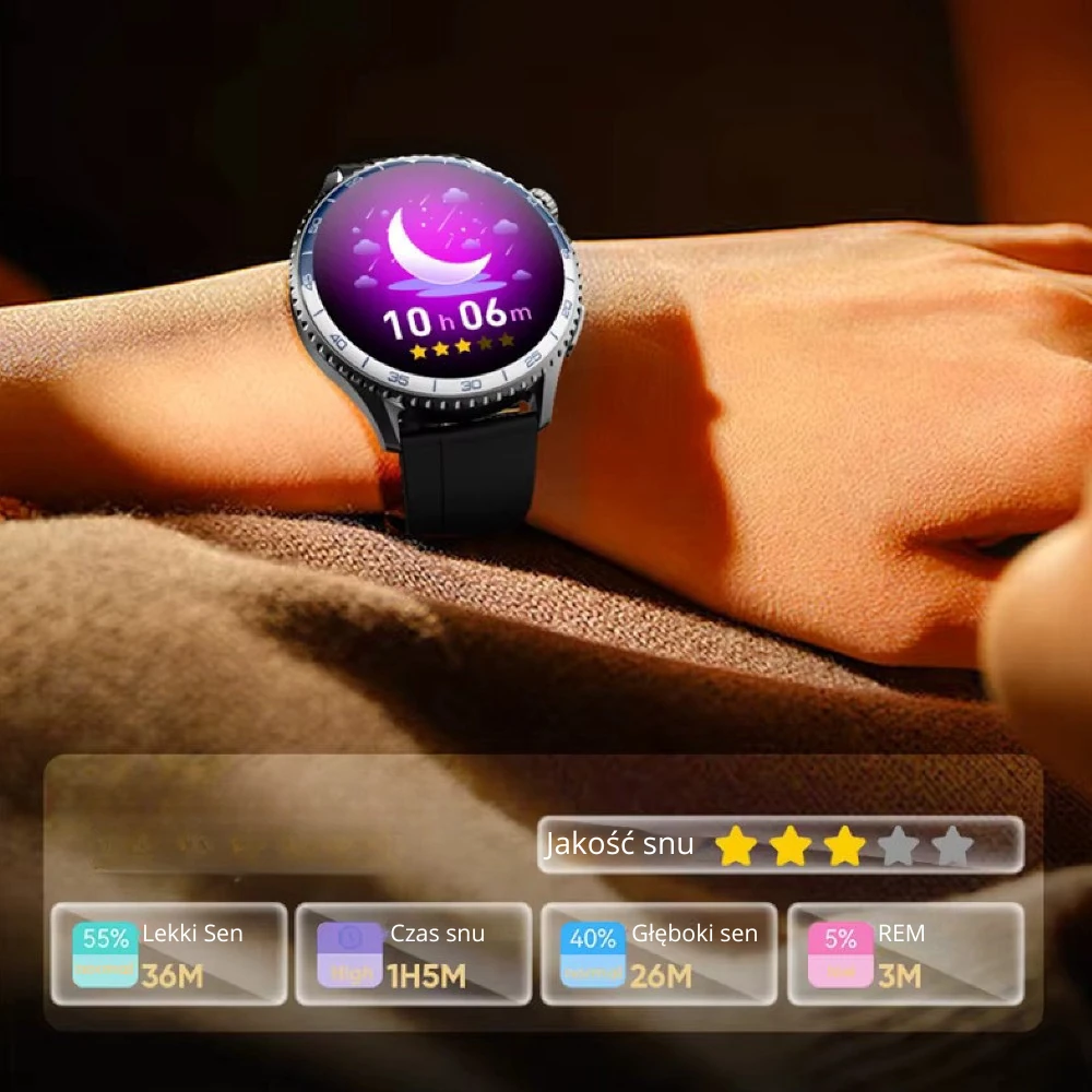 - Automatyczna analiza snu – zegarek monitoruje długość i jakość odpoczynku w godzinach od 21:00 do 9:00, dostarczając szczegółowych informacji.