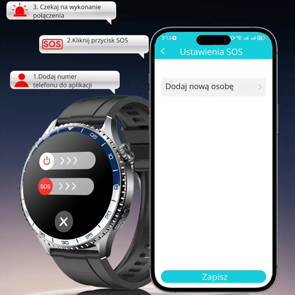 Urządzenie zostało także wyposażone w SOS dla seniora jest to funkcja szybkiego alarmu do wybranych kontaktów używamy jej gdy poczujemy się zagrożeni.
