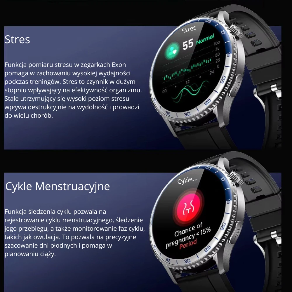 Kardiowatch EKG Exon Care oferuje zaawansowaną funkcję monitorowania cyklu menstruacyjnego, która pozwala kobietom precyzyjnie śledzić każdą fazę cyklu, od owulacji po menstruację. Dzięki inteligentnym algorytmom zegarek analizuje dane i przewiduje kolejne etapy cyklu, umożliwiając dokładniejsze planowanie aktywności, treningów czy odpoczynku.