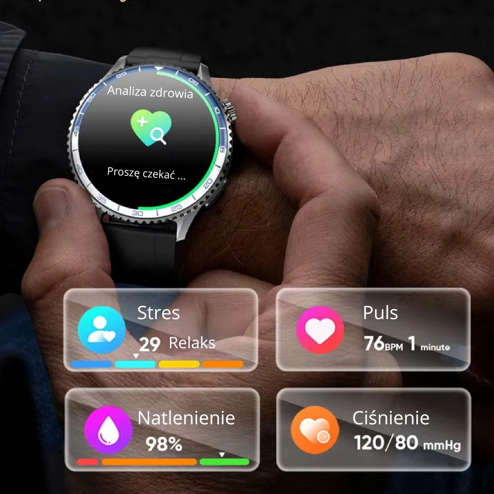 Precyzyjne monitorowanie rytmu serca, analiza Lorentza i raporty EKG, bezbolesne i szybkie odczyty poziomu cukru, stała kontrola kluczowych parametrów zdrowotnych, pomiar poziomu tlenu dla lepszego monitoringu wydolności organizmu, analiza faz snu i jego jakości.