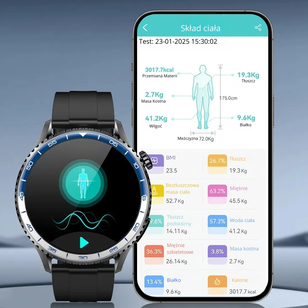 | Funkcje | cykle menstruacyjne, czasomierz, alert o zasiedzeniu, analiza składu ciała, automatyczny monitoring tętna, budzik alarm, cel kroków, ciśnieniomierz, funkcja rozmów, funkcja SOS, godzina data dzień, gry, historia aktywności, historia kroków, kalibracja pomiarów, kalkulator, krokomierz, książka telefoniczna, monitor bezdechu sennego, monitor snu, monitor stresu, natlenienie krwi, odtwarzacz muzyki, pogoda, pomiar cukru we krwi, pomiar EKG, pomiar tętna, powiadomienia, przebyty dystans, przycisk SOS, regulacja jasności i czasu podświetlenia ekranu, rejestr połączeń, spalone kalorie, sterowanie muzyką, stoper, termometr, tryb samolotowy, tryby sportowe, voice chat, wiadomości, wibracje, zdalny aparat, zmienne tarcze, znajdź telefon |