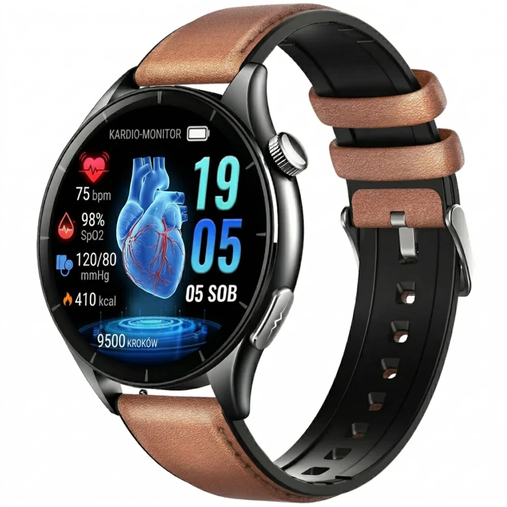 Kardiowatch Exon EKG Guard to zaawansowany smartwatch medyczny zaprojektowany z myślą o precyzyjnym monitorowaniu najważniejszych parametrów zdrowotnych. Dzięki nowoczesnym czujnikom i udoskonalonej technologii optycznej, urządzenie umożliwia dokładny pomiar EKG, tętna, ciśnienia krwi, poziomu cukru, natlenienia krwi (SpO₂), HRV, temperatury ciała, oddechu oraz poziomu stresu. To niezawodne narzędzie dla osób, które chcą świadomie dbać o zdrowie i mieć stały dostęp do kluczowych danych medycznych.