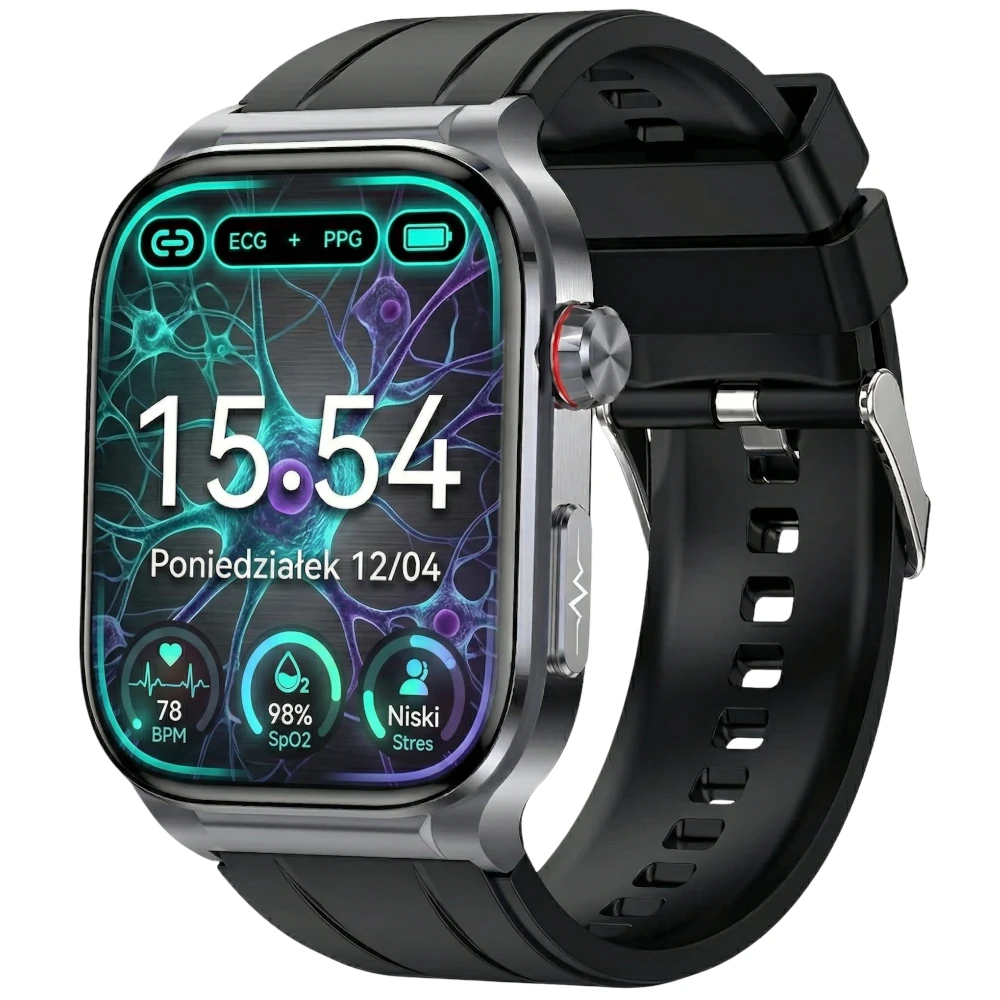 Kardiowatch EKG Exon Pulsemed to nowoczesny smartwatch stworzony z myślą o kompleksowym monitorowaniu zdrowia i aktywności. Wyposażony w precyzyjne czujniki EKG, PPG i SpO₂, umożliwia pomiar pulsu, ciśnienia, temperatury, glukozy, a także cholesterolu, trójglicerydów i kwasu moczowego – bez użycia igieł. Duży wyświetlacz AMOLED 2.04" zapewnia żywe kolory i doskonałą czytelność, a wbudowany mikrofon i głośnik pozwalają na wygodne prowadzenie rozmów przez Bluetooth. Smartwatch oferuje ponad 100 trybów sportowych, monitoring snu, funkcję pogody oraz wydajną baterię, która działa nawet do 7 dni. To idealne połączenie funkcjonalności, stylu i troski o zdrowie – zawsze na Twoim nadgarstku.