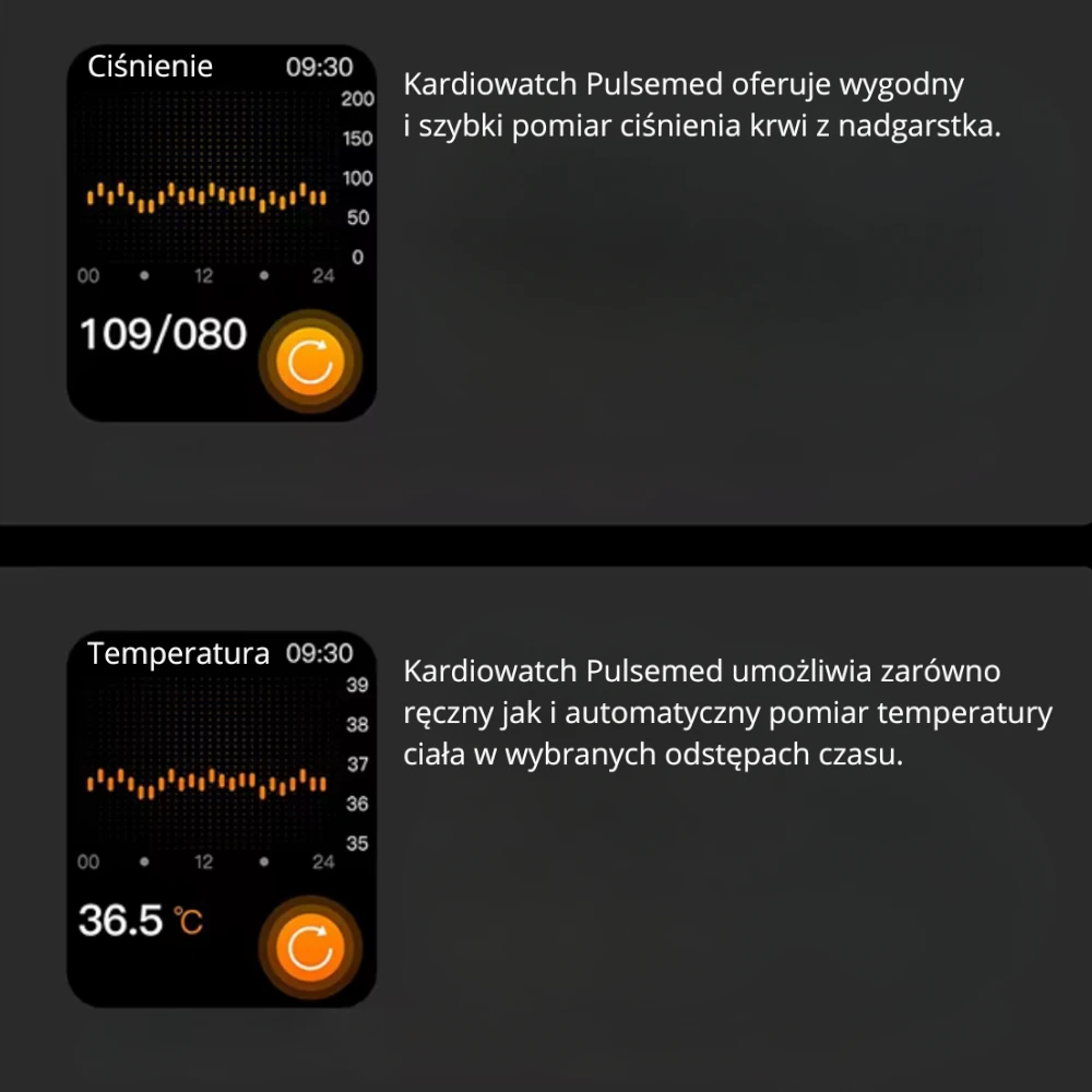 Kardiowatch Pulsemed umożliwia zarówno ręczny, jak i automatyczny pomiar temperatury ciała w wybranych odstępach czasu. Dzięki funkcji „Alarm temperatury” możesz ustawić próg ostrzegawczy – po jego przekroczeniu zegarek powiadomi Cię wibracjami, umożliwiając szybką reakcję. Aby zapewnić jak najdokładniejszy wynik, pomiar należy wykonać po około 10 minutach od założenia zegarka. Warto pamiętać, że temperatura otoczenia również może wpływać na ostateczny odczyt.