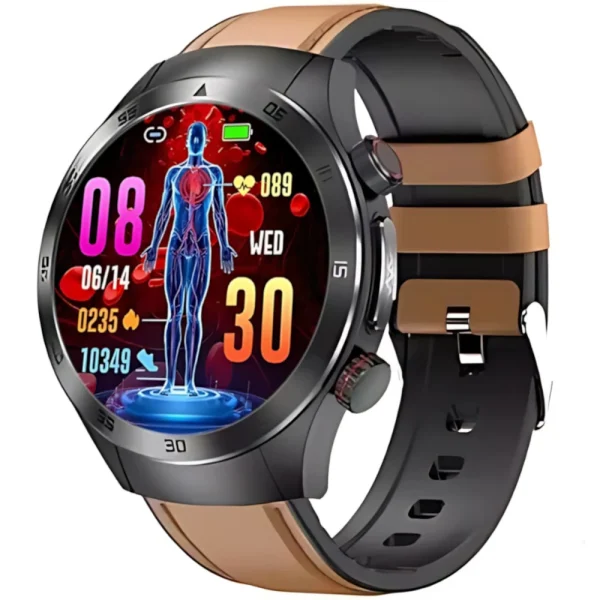Inteligentny zegarek EKG jest wyposażony w nowoczesną funkcję pomiaru glukozy we krwi, która pozwala na codzienną kontrolę poziomu cukru bez użycia igieł i tradycyjnych metod. Pomiar trwa około 30 sekund, a wyniki są prezentowane w czasie rzeczywistym, co umożliwia szybką reakcję na zmiany poziomu glukozy.