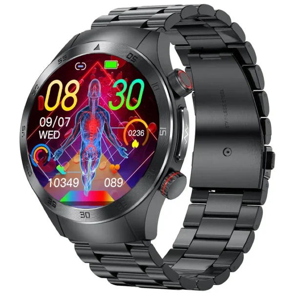 Zegarek EKG oferuje innowacyjną terapię laserową o długości fali 650 nm, która aktywuje czerwone krwinki, poprawia płynność krwi oraz redukuje jej lepkość. Dzięki temu pomaga rozpuszczać skrzepliny i toksyny, wspierając proces oczyszczania krwi. Terapia laserowa może skutecznie obniżyć nadciśnienie, poprawić lipidogram i wspomóc walkę z cukrzycą, wspierając lepsze krążenie i zdrowie układu sercowo-naczyniowego.