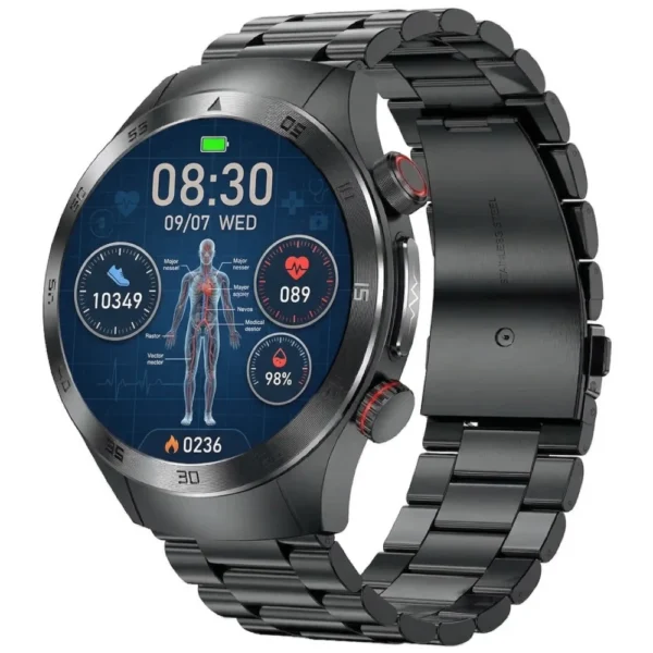 Nowoczesny kardiowatch medyczny EKG Exon Therapy wyposażony w zaawansowane funkcje monitorowania zdrowia a także innowacyjną funkcję terapii laserowej o długości fali 650 nm, która aktywuje czerwone krwinki, poprawia płynność krwi oraz redukuje jej lepkość. Umożliwia pomiar EKG, HRV, ciśnienia krwi, poziomu glukozy, cholesterolu i kwasu moczowego, a także saturacji, temperatury ciała i tętna z możliwością ustawienia alarmów. Wspiera monitorowanie snu, cyklu menstruacyjnego i aktywności fizycznej, oferując 9 trybów sportowych. Posiada funkcje odbierania połączeń, powiadomień, licznika kroków, pogody, stopera oraz asystenta głosowego. Synchronizacja z aplikacją zapewnia zapis i analizę wyników w czasie rzeczywistym. Idealny dla osób dbających o zdrowie i aktywny styl życia.