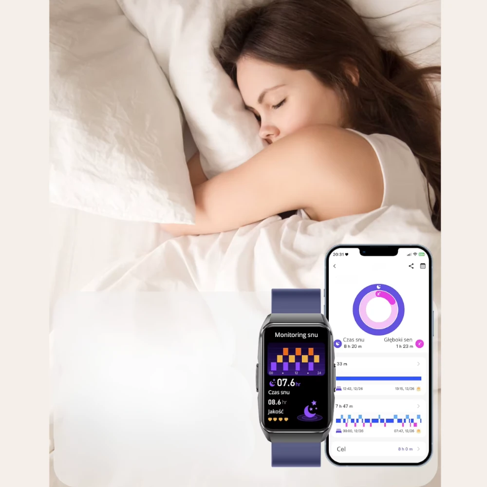 • Sen i regeneracja – smartwatch analizuje długość, jakość i fazy snu, pomagając zadbać o lepszy wypoczynek.