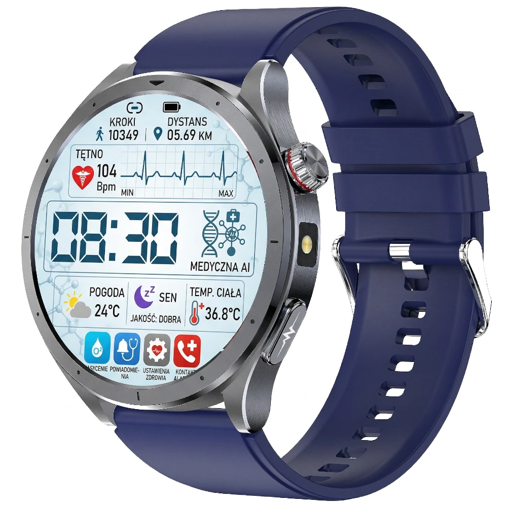 Zegarek oferuje orientacyjny monitoring takich danych jak: zapis EKG z wykresem pracy serca, tętno (HR), natlenienie krwi (SpO₂), wskaźnik ciśnienia, temperatura ciała, poziom stresu, zmienność rytmu serca (HRV) oraz analiza oddechu.