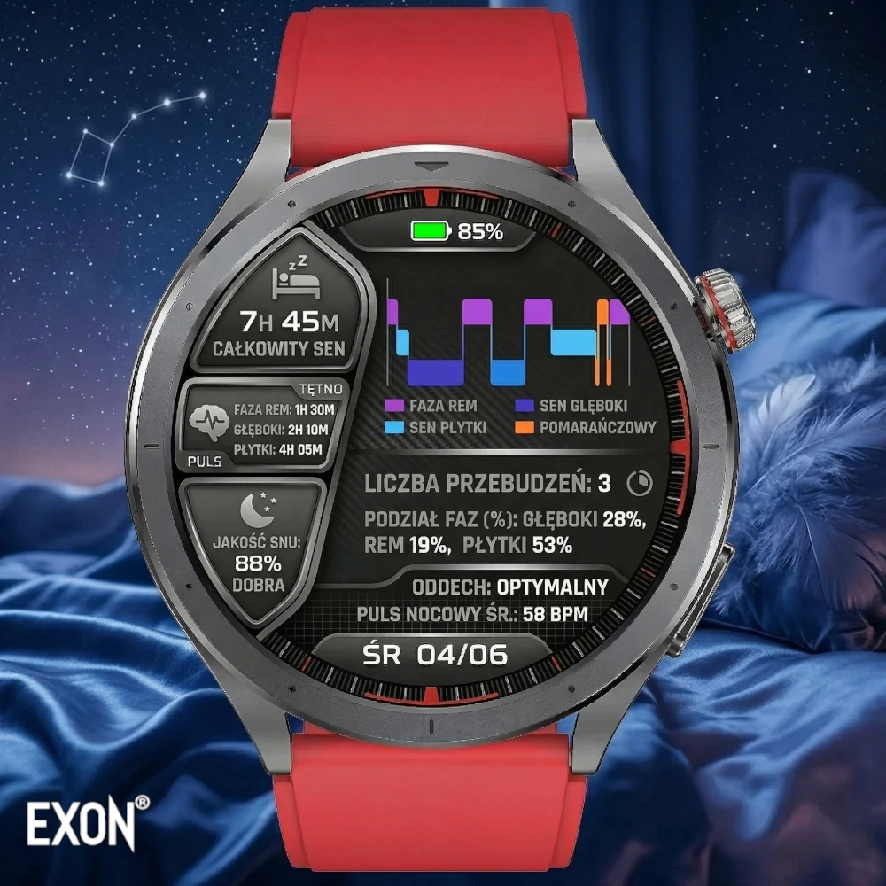 Exon Vigil oferuje szeroki zakres funkcji zdrowotnych, w tym monitoring snu, analizę HRV, poziomu stresu, zmęczenia oraz emocji, a także zapis i historię pomiarów, co pozwala lepiej zrozumieć reakcje organizmu i obserwować zmiany w czasie.