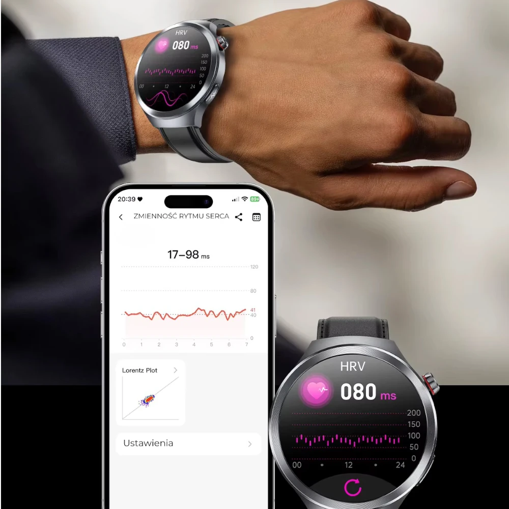 Zwykły smartwatch korzysta z technologii PPG – mierzy przepływ krwi w naczyniach włosowatych za pomocą diody LED i sensora światła. To metoda wystarczająca do śledzenia aktywności fizycznej, ale dająca dane jedynie orientacyjne. Moduł EKG w kardiowatch analizuje faktyczne impulsy elektryczne serca i potrafi wykryć: